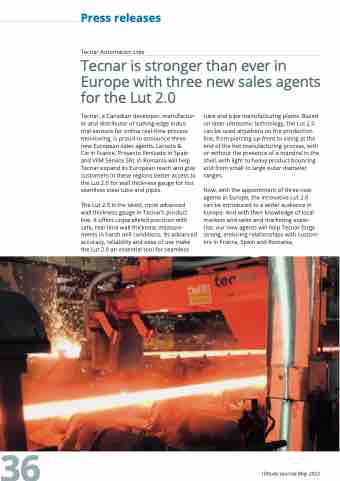 Cie in France, Proyecto Ilimitado in Spain and VFM Service SRL in Romania will help Tecnar expand its European reach and give customers in these regions better access to the Lut 2.0 for wall thickness gauge for hot seamless steel tube and pipes.