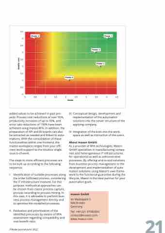 added values to be achieved in past pro- jects: Process cost reductions of over 50%, productivity increases of up to 90%, and error rate reductions of 100% have been achieved using maesn RPA. In addition, the preparation of KPI and BI boards can also be extracted as needed and linked to auto- mations. With the consolidation of these functionalities within one frontend, the maesn workspace ranges from your effi- cient work-support to the intuitive single- source-of-work.