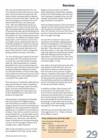 On over 40,000 square metres of net exhi- bition space with 765 exhibitors from 44 countries the international tube and pipe trade fair Tube showcased the complete bandwidth from tube manufacturing and finishing to pipe and tube accessories, tube trading, forming technology and machin- ery and plant facilities. Process technology tools, auxiliaries and measuring and control technology as well as test engineering also rounded off the ranges here.