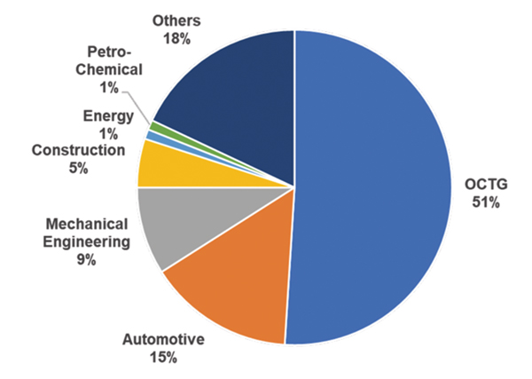 The industry in 2021 had an impressive restart, led by China, and followed by other regions, particularly the USA and Europe. Consequently, the need for energy supplies such as oil and gas ballooned, with direct implications for energy prices and the demand for OCTG tubes and pipes (51% of the total market).