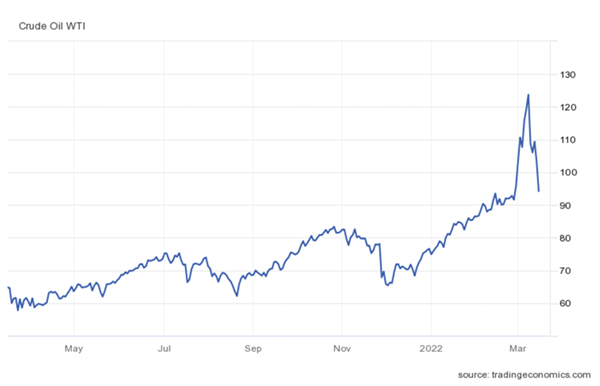 The Western Texas Immediate (WTI) crude oil price boomed from January 2021, 55 US$/Bbl, by 160%, climbing to 88 US$/Bbl on 3rd of February 2022(Fig. 6). On February 24th, 2022, the Russian army started the invasion against its sovereign neighbour Ukraine. The invasion ordered by Russian President Vladimir Putin represents an escalation of the Russian-Ukrainian war that has been simmering since 2014 by extending it to the entire territory of Ukraine. As countermeasure hard sanctions were imposed on Russia. In consequence the prices for energy, gas and oil ballooned to unknown hights of almost 130 US$/Bbl (Fig. 6) on March 8th ,2022. The envisaged shortage of oil and gas supplies let the US and European governments restart talks with the former sanctioned oil producing countries Venezuela and Iran to possibly replace the Russian oil supplies. Somehow the world is suffering from some political leaders of the oil and gas producing countries. These perspectives and the reappearance of corona in some major Chinese cities released some of the oil price pressure to an oil price of about 95 US$/Bbl these days.