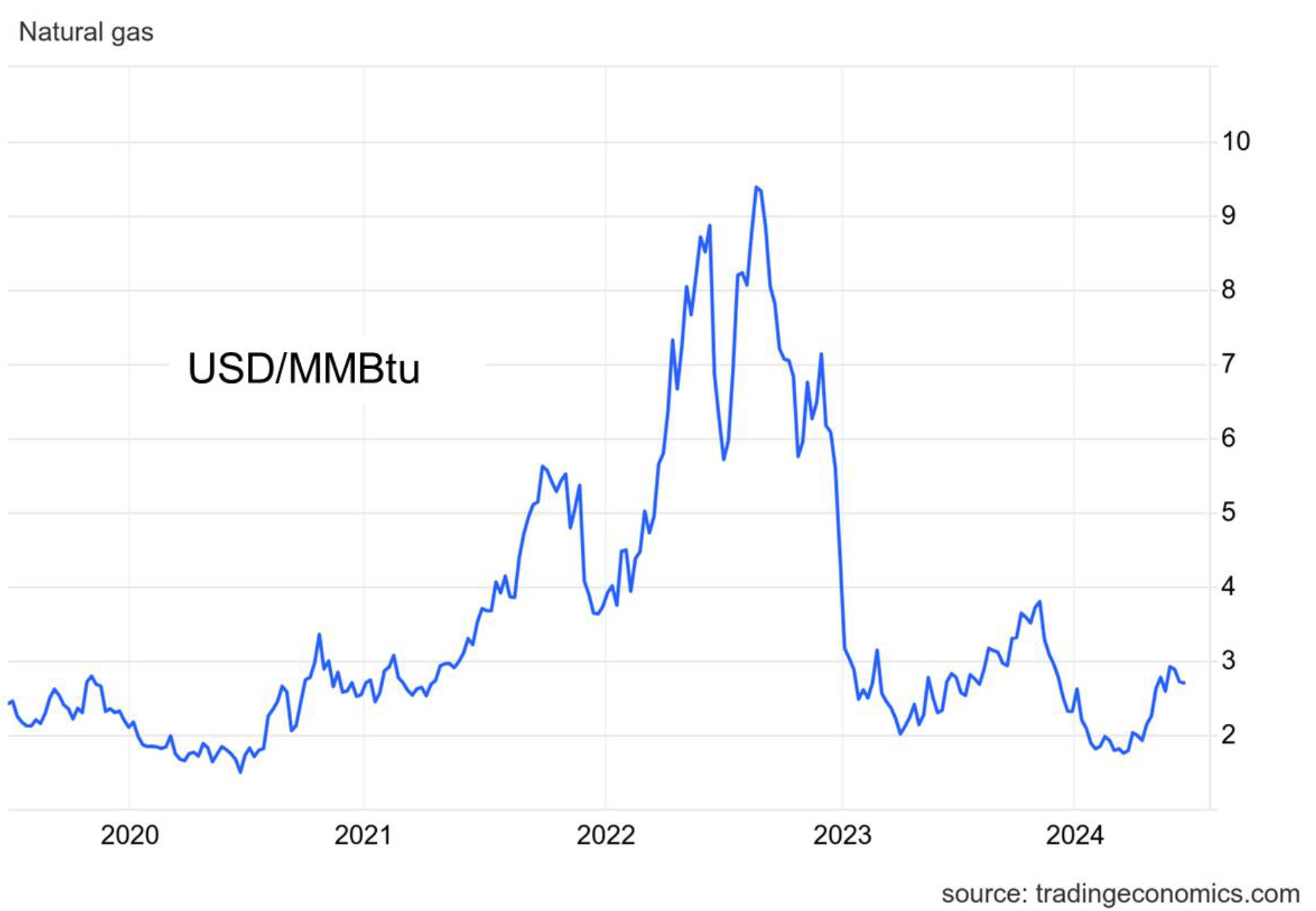 Cost of natural gas, after turbulent times climbing in 2022 up to levels higher than 9 USD/MMBtu and another sharp increase in 2023 up to 4 USD/MMBtu, has now again climbed up again to a level of about 2,7 USD/MMBtu, which is about 30% higher than early 2020 (Figure 2). The volatility of the natural gas price is still challenging the gas intensive industries and gas power plants. Europe anyhow, originally being supplied by Russian gas via pipelines at good values, now sources its gas needs to a great extend as LNG (Liquified Natural Gas). Just Austria and Poland still source their natural gas via Jamal pipeline from Russia. LNG on the other hand is by far more expensive than normal natural gas.
